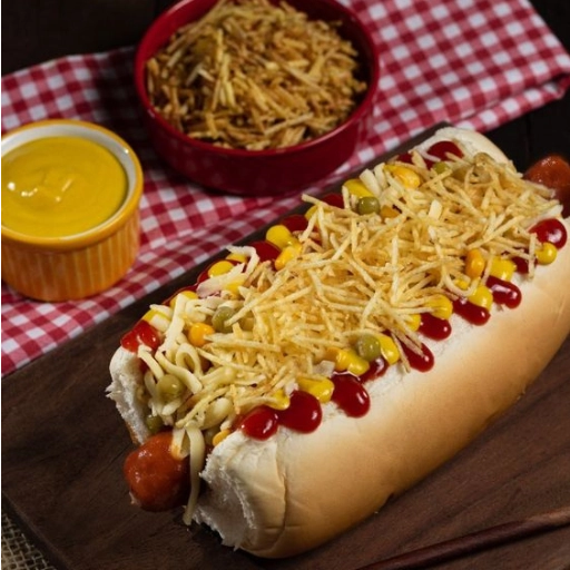 Pão, molho, milho, ervilha, batata palha, ketchup, ovo de codorna, azeitona, queijo ralado e maionese da casa